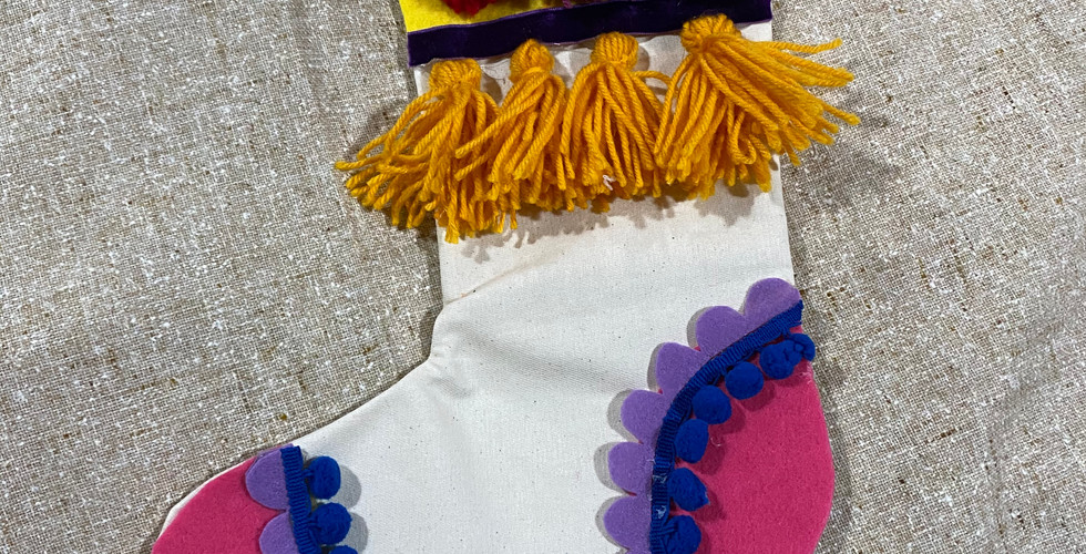 Then, everyone went TO TOWN on their own unique design, and they all turned out so beautiful! Our crafty guests added felt, pom poms, embroidery, ribbon, tassels, tiny baubles, foam shapes, sequins, garlands, wooden shapes, even drawing and painting designs onto the thick cotton drill we used as the base.